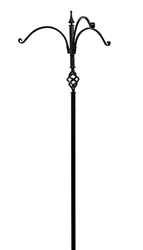 80" Heavy duty 6-piece sectional pole set. 1" Diameter. Includes 3 pole sections, LMQUAD three (premium forged twist) arm pole top, decorative BASK1 iron "basket" and the TWISTER twist in ground socket. 99" Overall "in ground" height. The height of the hang point on each arm is 92". 3 arm hanger has a reach of 12" from the pole. Can hold heavy feeders. Made in the USAFeatures: