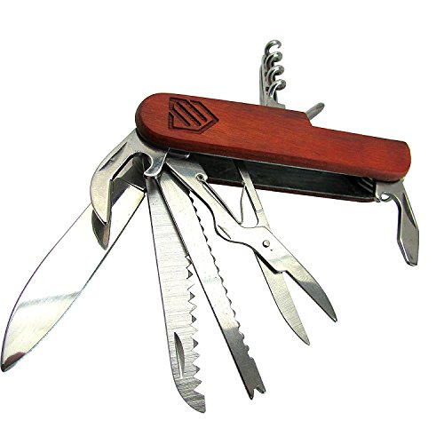 Swiss Army Style Pocket Knife 15-in-1 Wood Body by Vermont - Multi-tool Stainless Steel with Wood Body. Tactical, Survival, Hiking, Hunting, and Camping. Great Training Gifts for Boy Scouts.