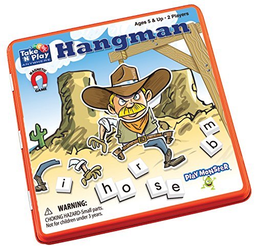Product Description Take ‘N’ Play Anywhere games feature big magnetic playing pieces that are easy for kids to use and hard for kids to lose! The convenient 6 3/4" square tin case makes it easy to slip the games into most bags to take everywhere and keep kids entertained on a trip, waiting at the doctor’s office, dining out, while stuck in traffic or just visiting grandma’s house! From the Manufacturer Take 'N' Play Anywhere games feature big magnetic playing pieces that are easy for kids to use and hard for kids to lose. The convenient 6 3/4" square tin case makes it easy to slip the games into most bags to take everywhere and keep kids entertained on a trip, waiting at the doctor's office, dining out, while stuck in traffic or just visiting grandma's house. In Hangman, these magnetic pieces allow you to play this word game anywhere. Guess an incorrect letter and a body part is added. Solve the word before you're hung.Features: