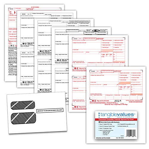 About the W-2 Tax Kit: This tax kit from Tangible Values Business Solutions has everything you need to file taxes for up to 25 individuals. These forms are guaranteed to be IRS approved and compliant. This kit is QuickBooks and Intuit compatible and great for small businesses. Tangible Values is a trusted brand that is enrolled in Amazon Transparency. This kit includes: (25) W-2 4-part Forms, (3) W-3 Transmittal Forms, and (25) Self-Seal Envelopes.Features:
