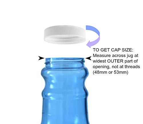 - 3 caps included. For proper fit, measure the OUTSIDE diameter at the top of the jug's neck opening. The size 48mm cap will work for jugs with an 48mm OUTER diameter neck opening, and the size 53mm cap will work for jugs with a 53mm OUTER diameter neck opening. These are also THREADED caps, and will only work with THREADED jugs.