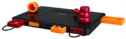 Dogs are very playful and intelligent animals. Channel their energy and curiosity into something positive with TRIXIE's Move-2-Win. With four levels of play that require practice and concentration, this game is designed for the advanced canine game player. Level 1: Lift up cones. Design prevents cones from being knocked over. They must be lifted straight up. Level 2: Tug open red drawers using loops Level 3: Push slider knob along the path to open two yellow drawers Level 4: Place cones in top holes and use as stoppers Keep your dog challenged and curious by varying the number and placement of treats. The non-slip rubber feet keep the box in place as your dog pulls, lifts and explores. We've also included an instructional booklet with tips and tricks for challenging and training dogs of all ages through play. Dishwasher safe. One year warranty. Measures 13 x 5 x 2 inches. Weight 3 lbs.Features: