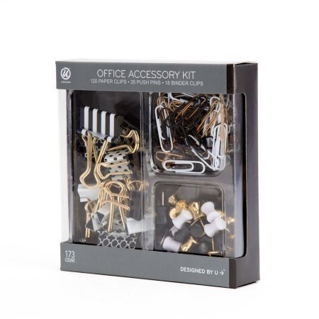 ~6 medium binder clips that are 1-1/4" wide and hold up to 1/2" of paper ~12 small binder clips that are 3/4" wide and hold up to 1/3" of paper ~35 standard size push pins with black, white or gold plastic head and steel needle point ~120 medium size vinyl coated metal paper clips that are 1-1/8" longFeatures: