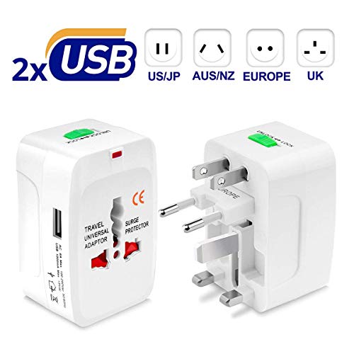 Universal Travel Plug Adapter, All in One Worldwide Universal Wall Charger AC Power Plug with 2 USB Charging Ports for EU, US, UK and AU - White