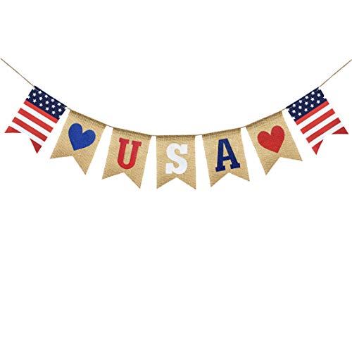 Uniwish USA Banner Burlap Bunting 4th of July Decorations American Independence Day Celebration Red White and Blue Theme Party Supplies