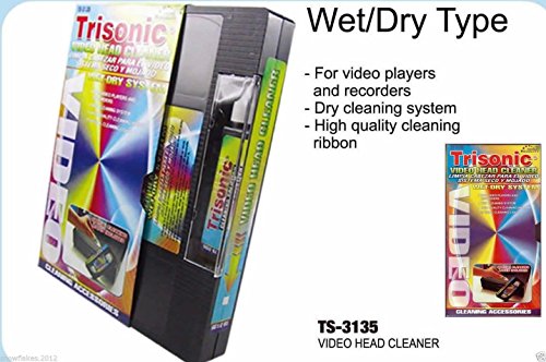 VHS VCR Video Head Cleaner: Cassette, High Quality, Wet / Dry System Trisonic Video Head Cleaner is not only effective but easy to use. It is essential to keep your VCR clean in order to have a clear picture and sound. Cleaning insures maximum viewing color and clarity by removing accumulated foreign materials from video heads, pinch rollers and capstans. Easy to use instructions for use included on back of case in English & Spanish. The unique 2 step cleaning process makes it fast and easy to use. Includes a bottle of high quality special cleaning solution and a high quality cleaning ribbon to effectively clean video cassette players easily. For both video players and recorders. May be used as a wet or dry cleaning system if desired.Features: