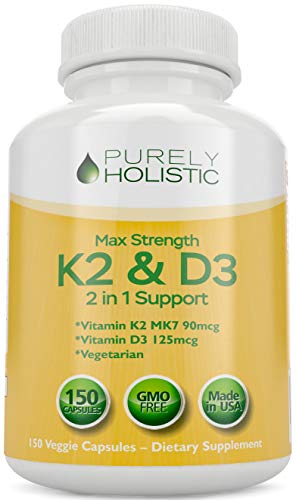 The Benefits of Vitamin D3 and Vitamin K2 Vitamin D3 and Vitamin K2 work together to support and promote: Stronger bones & healthy muscle function* Cardiovascular support* Healthy Immune System & mood support* Improved Calcium Absorption* Why Buy Purely Holistic Vitamin K2 & Vitamin D3? *100% MONEY BACK GUARANTEE - Not satisfied with your purchase from us? We offer a no questions asked return policy. We want you to be 100% satisfied with our products or your money back. *#1 FOR VALUE! 50% MORE CAPSULES - Purely Holistic boasts 150 Vitamin K2 and Vitamin D3 capsules per container 50% MORE than most competing brands. *PREMIUM STRENGTH & INGREDIENTS - You receive premium strength Vitamin D3 with 5000IU per capsule, plus we use MK7 Vitamin K2, the most bioavailable form of K2 (not cheaper forms of K2 that some brands use) . * GMO FREE - Our premium Vitamin D3 and K2 supplement is GMO free. *These statements have not been evaluated by the Food and Drug Administration. This product is not intended to diagnose, treat, cure, or prevent any disease.Features: