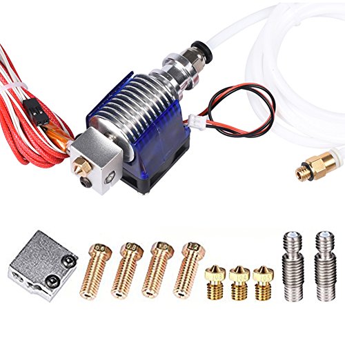 - Package include: all metal V6 hotend 12v/40w/1.75mm/0.4mm extruder full kit(V6 print head + fan + fan cover + PTFE tube + tube fitting ), 3 pcs brass extruder nozzles(1x0.3mm/1x0.4mm/1x0.5mm), 4 pcs brass volcano extruder print head(1x0.6/1x0.8/1x1.0/1x1.2) and a volcano heating block, 2Pcs teflon tube within 1.75mm stainless steel nozzle throat