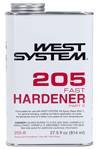 The product type is West System 205 Fast Hardener. It is manufactured by Gougeon Brothers, Cures to maximum strength: 1 to 4 days. Minimum recommended temperature: 40°F (4°C). Pair with WEST SYSTEM 105-B Epoxy Resin.Features: