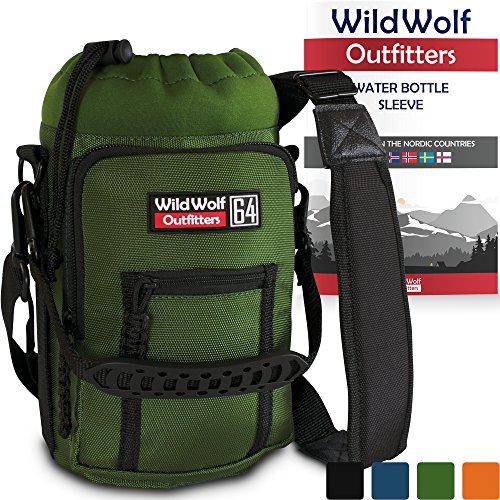 Wild Wolf Outfitters Part#: 712038587575 - Wild Wolf Outfitters Water Bottle Holder for 64oz Bottles Green - Carry, Protect and Insulate Your Best Flask with This Military Grade Carrier w/ 2 Pockets & an Adjustable Padded Shoulder Strap